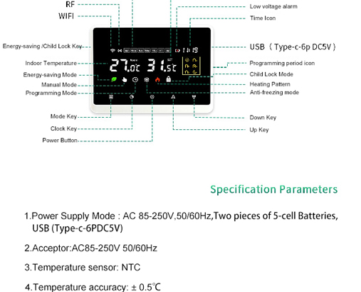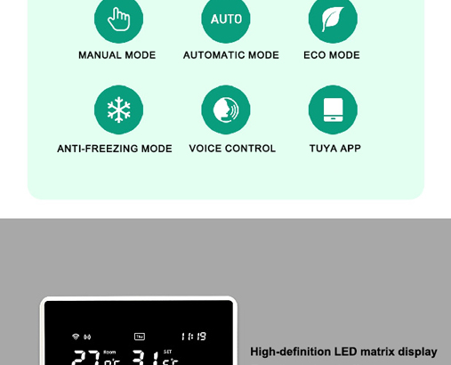 يدعم هذا الترموستات متعدد الاستخدامات عملية مزدوجة الوظيفة —التبديل بسلاسة بين وضعي التبريد والتدفئة بناءً على الاحتياجات الموسمية. التحكم الذكي بالتطبيق يتيح للمستخدمين إدارة درجات الحرارة الداخلية في أي وقت وفي أي مكان عبر الهاتف الذكي، والاندماج بسهولة في أنظمة المنزل الذكي الحديثة.